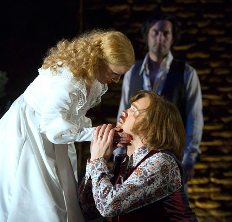 Don Basilio (Alan Oke), Count (Audun Iversen) and Susanna (Lydia Teuscher).